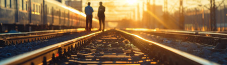 A captivating view of train tracks during sunset, featuring beautiful golden light glinting off the metal and gravel, creating a serene atmosphere ideal for travel themes.