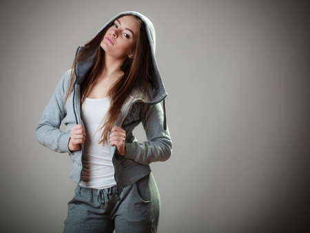 Portrait of young woman teen girl long hair in hooded sweatshirt on gray background