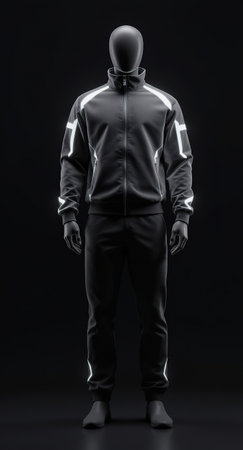 Black sports tracksuit featuring reflective accents on the jacket and pants, displayed on a mannequin. Minimalist design with a sleek and modern aesthetic against a dark backdrop.
