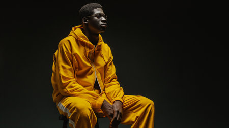 Young african american man in yellow hoodie sitting on chair against black background