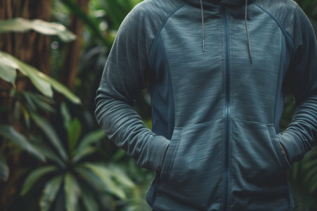 A close-up on a fitness enthusiast in a textured sports hoodie, ready for an outdoor workout amidst lush greenery, symbolizing health and wellness