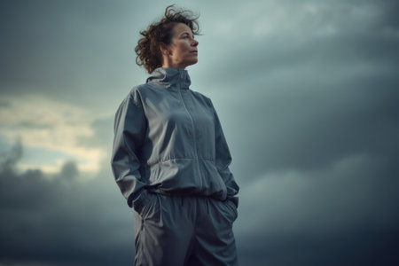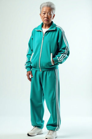 Older woman standing in teal tracksuit with hands in pockets and serious expression. Studio portrait