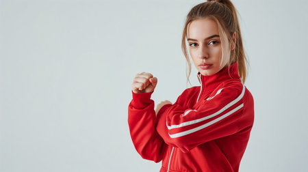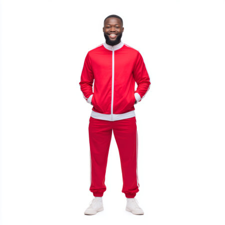 A joyful athletic man stands confidently in a vibrant red tracksuit, smiling and posing playfully. The bright background enhances his lively expression, ideal for fitness and lifestyle themes.