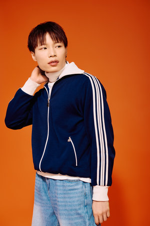 A young asian man dressed in trendy attire stands with poise, showcasing his fashion sense.