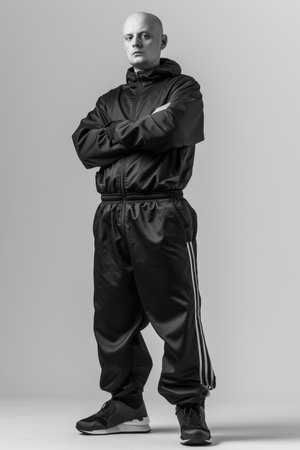Portrait of a man in a retro black tracksuit from the 90s. Stylish hipster in a tracksuit on a gray background.