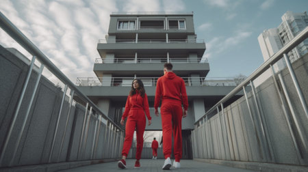 Motivated active ethnic couple run up stairs together jump highly train climbing staircase in city wear comfortable sportsclothes drink water from bottle climb challenge : Generative AI