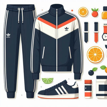 Vector illustration of sportswear, sneakers, bottle of water, fruits and other items.