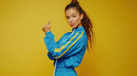 Confident athlete in bright retro gear on yellow background. Lively setup for exercise or 80s fashion themes, great for dynamic or trendy designs. Perfect for gym or vintage visuals.