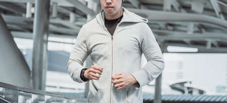 Advertising concept for running clothes. Cropped view of sportive man with smartwatch zips up his sportswear jacket, standing against urban background, prepare to sport training outdoors