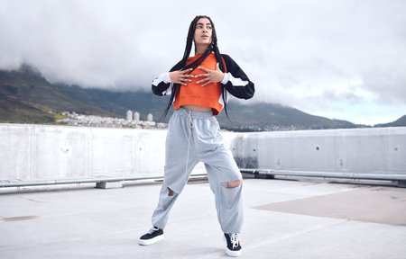 Woman, hip hop and outdoor dancing in city for freedom with streetwear fashion, talent and movement with energy. Gen z girl, urban rooftop and creative dance or performance with fun passion for hobby