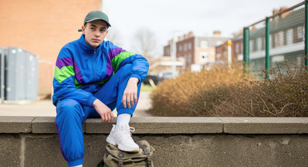 Young caucasian male in retro tracksuit sitting on urban wall outdoors