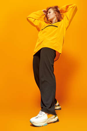 Modern style dancer girl posing at studio on a yellow background. Full length portrait.