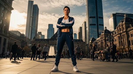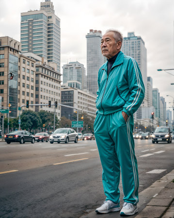 Elderly man in teal tracksuit standing on a busy city street surrounded by modern buildings. Active lifestyle concept