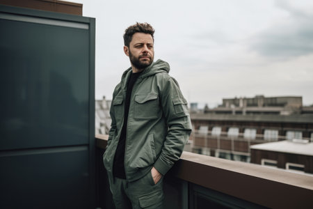 Portrait of a handsome man in a green raincoat standing on the roof