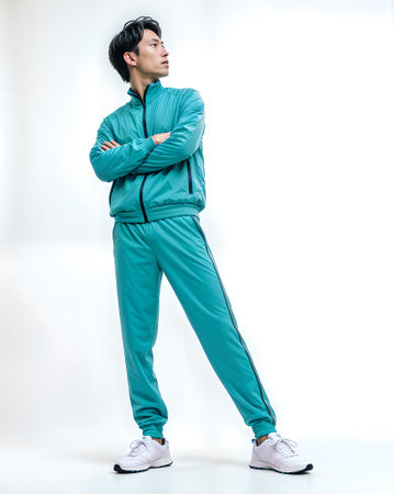 Man in teal tracksuit with crossed arms standing confidently on a white background. Studio fashion shoot