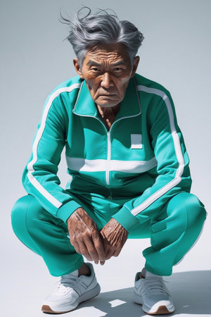 Older man in teal tracksuit crouching with serious expression. Studio portrait
