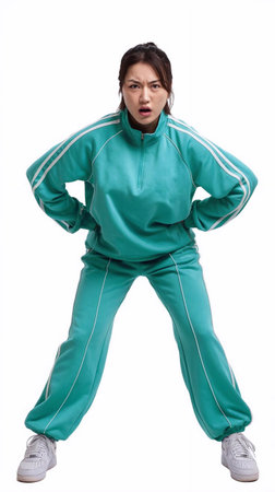 Woman in teal tracksuit yelling with hands on hips and fierce expression. Studio portrait