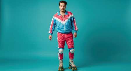 Retro 80s cool! Young man in a pink and blue tracksuit & vintage roller skates poses confidently in studio. Nostalgic fashion, fun fitness concept.