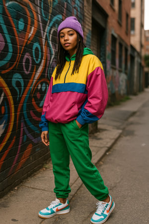 A young woman dressed in a colorful outfit poses confidently against a graffiti wall