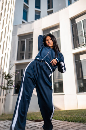 An attractive Asian woman in sportswear posing in the street