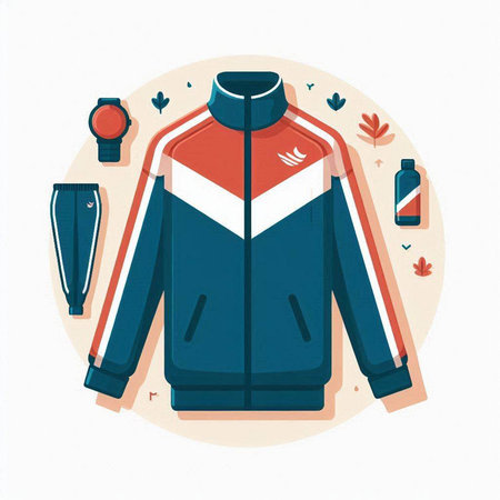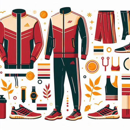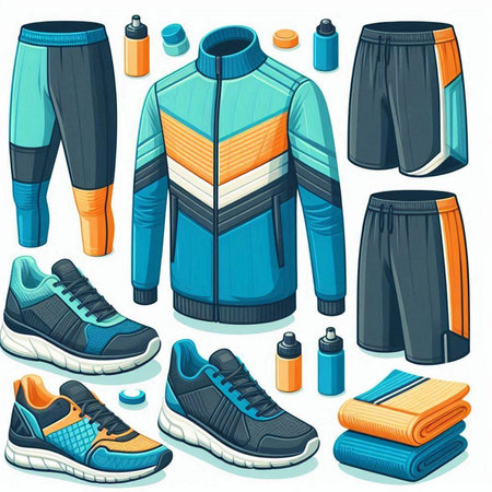 Vector illustration of sportswear, sneakers, bottle of water, fruits and other items.