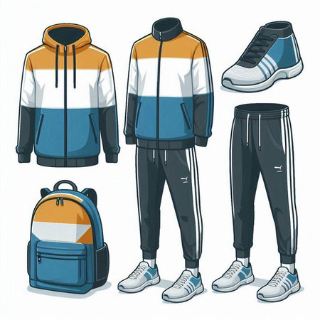 Vector set of sportswear isolated on white background. Sneakers, jacket, shorts, bag, sneakers.