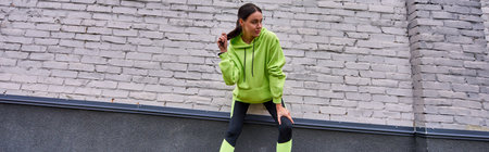 attractive sportswoman in hoodie and leggings touching ponytail and standing near grey wall, banner