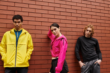 Three young people in athletic style lean against a red brick wall, exuding energy.