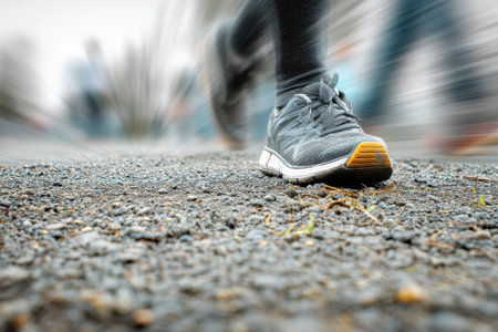 Close up of running shoes in motion on a path with blurred background for stock photography use
