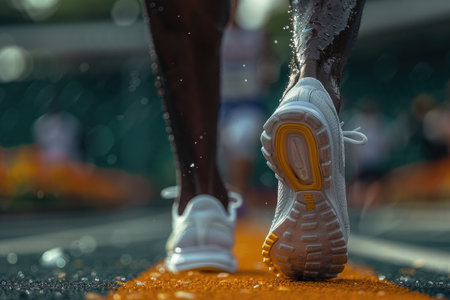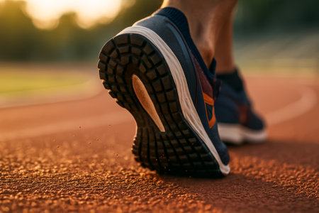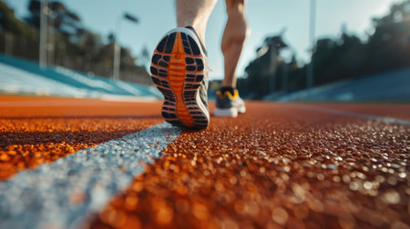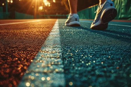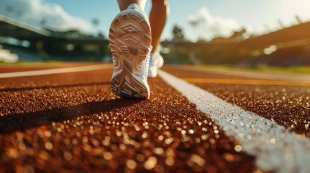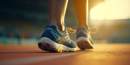 A close-up view of an athlete's legs and running shoes on a track, captured during golden hour in a stadium. The image highlights determination, fitness, and the energy of sports in a vibrant, dynamic setting.
