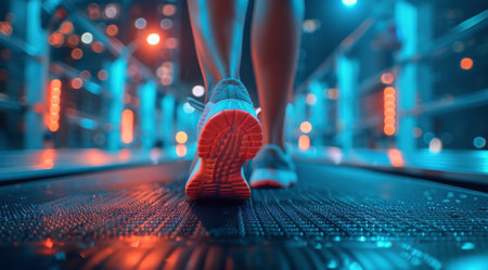 Generative AI : Athlete runner feet running on treadmill closeup on shoe Track and field runner in sport uniform at starting position Fitness lifestyle sport and healthy concept