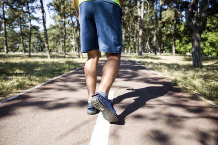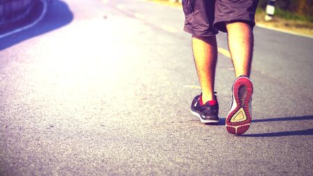 Man runner feet on road in Park workout wellness soft focus and focus close up on shoe with copy space for text or design