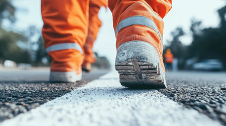 Modern asphalt road with white stripes and a person in uniform using a machine to paint the crosswalk on the highway, workers working on the airport runway for safety. A person wearing orange overalls standing near the concrete tarmac of the flight path. Sunny day, wide-angle lens. --chaos 30 --ar 16:9 --v 6.1 Job ID: 8223294e-c797-4616-ba2c-554055c78722