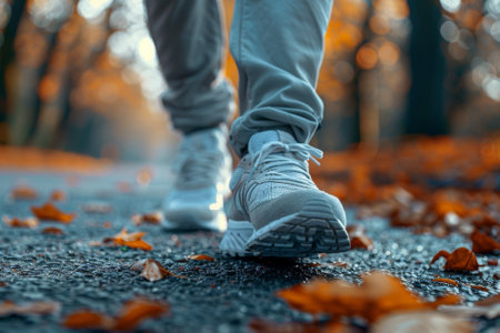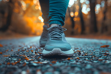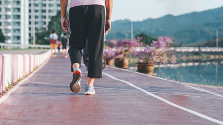 A person is walking along an asphalt path with white directional arrows and the word walk painted on it. The image uses a low-angle perspective, showing the feet and legs of the person. The style has a natural aesthetic. The photograph might be suitable for various commercial and editorial applications, focusing on lifestyle and fitness concepts.