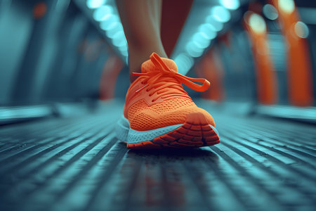 Close-up of bright running shoes in action on a treadmill, depicting a fitness workout in a gym setting. Sport gym fitness concept.