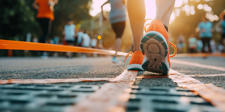 Runner's Feet Crossing Finish Line in Marathon Race at Sunrise.