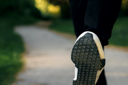 Close-up of a person's shoe while walking. Suitable for accompanying articles about the walking benefits, articles recommending places to walk for exercise, posting pictures with quotes about walking