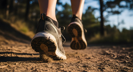 A person's journey along a beautiful hiking trail, with a focus on their hiking shoes and the path ahead