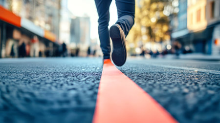 A businessman strides confidently across the finish line, marking a moment of triumph in an urban setting filled with energy and life.