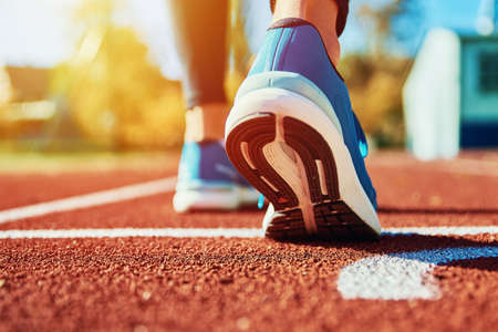 Runner feet on running track at sunset. Sport and healthy lifestyle concept.