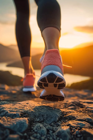 Runner feet running on city road at beautiful sunrise. woman fitness jogging workout wellness concept.