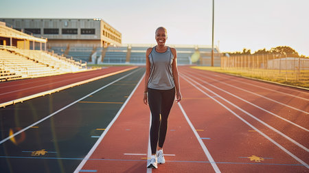 Smiling middle age black woman jogging at the sports stadium outside, African American lady running outdoors in the morning, AI generated image