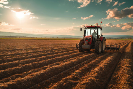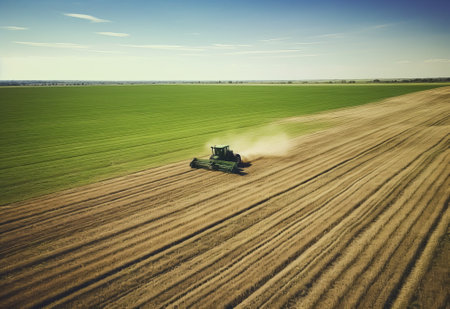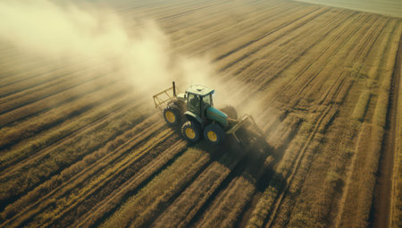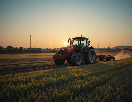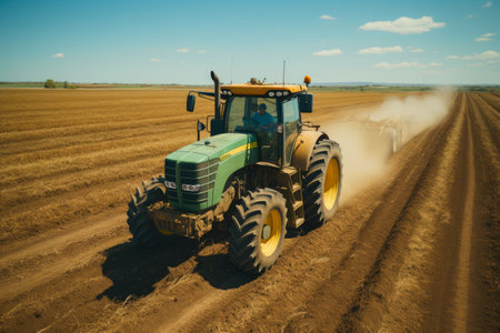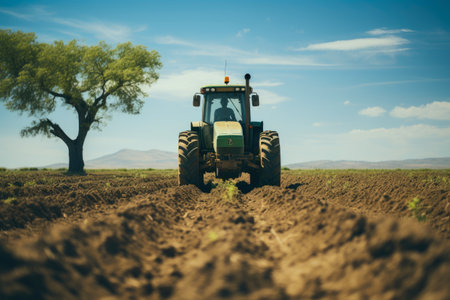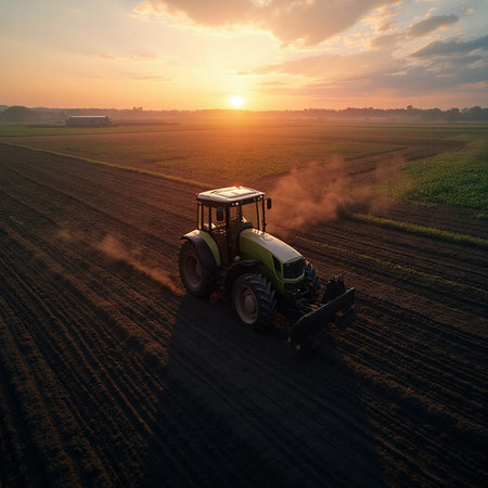 A modern tractor plows through an expansive agricultural field, preparing the soil for a new planting season under a clear sky. AIG41