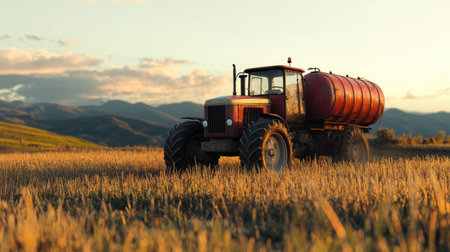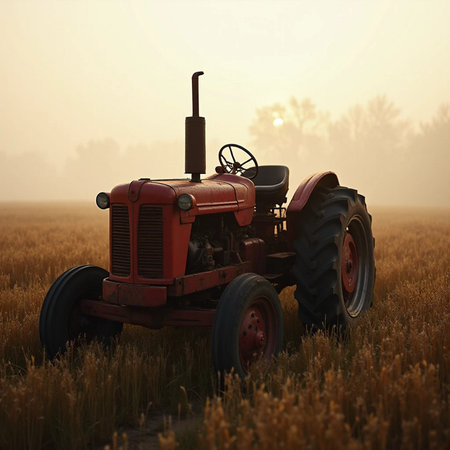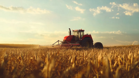 A vibrant red tractor stands proudly in a golden field at sunset, surrounded by gentle hills and dramatic clouds, embodying rural tranquility and agricultural beauty.