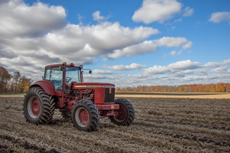 A red tractor is seen cultivating a recently plowed field with a backdrop of beautiful autumn trees under a partly cloudy sky.