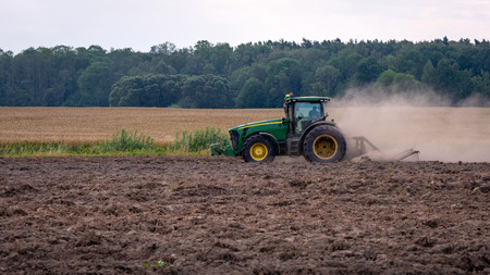 Varna, Bulgaria - Jul 09, 2020 Ploughing a field with John Deere 7730 tractor. John Deere was manufactured in 1995-1999 and it has JD 7.6L or 8.1L 6-cyl diesel engine.