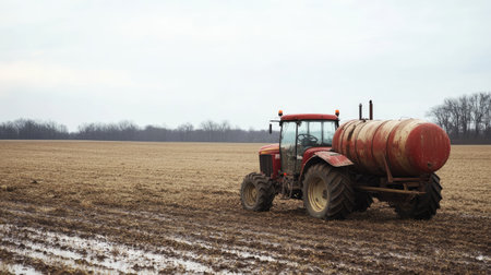 A red tractor equipped with a large tank is parked on a freshly plowed field during the planting season, under a cloudy sky, highlighting agricultural practices.