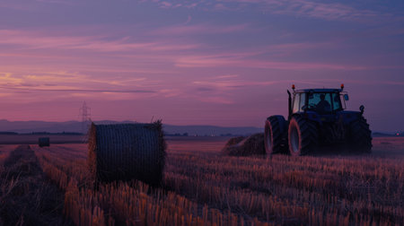 An agricultural landscape at dusk, showing a tractor creating bales of hay, with a sidebar of data points illustrating the importance of fodder in livestock nutrition and farm sustainability.