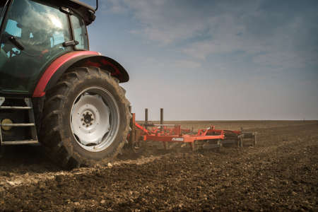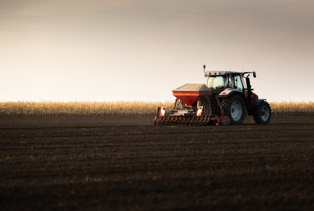 Farmer with tractor seeding - sowing crops at agricultural fields in spring