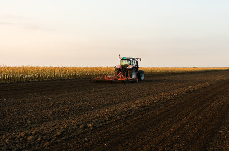 Farmer with tractor seeding - sowing crops at agricultural fields in autumn.